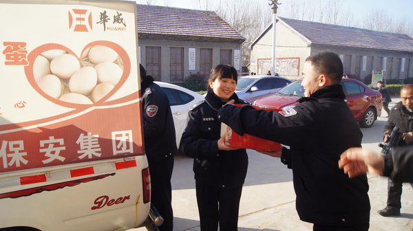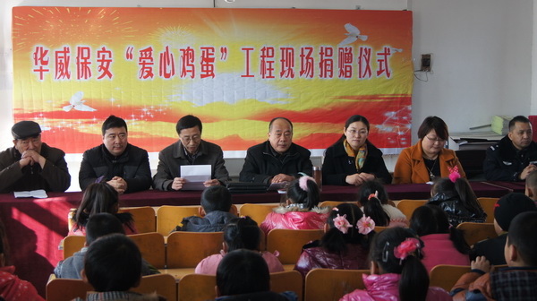 1月22日,2015年新年之際,帶著集團公司4000余名員工的一顆赤熱愛心,華威保安“愛心雞蛋”工程走進了姚村,進行愛心雞蛋捐贈活動。活動由集團監事會主席米永友主持,市關工委主任張繼鵬、姚村鎮黨委書記劉慧敏、姚村鎮副鎮長韋燕、集團黨總支副書記李曉虎等領導及姚村鎮中心小學60多名師生代表參加了捐贈活動。本次活動,集團公司共計為姚村鎮王村、春亭、馬廠、孔村、西孔、席場、孔村、薛村、姚小九所小學的263名一年級小學生捐贈雞蛋1300余斤。