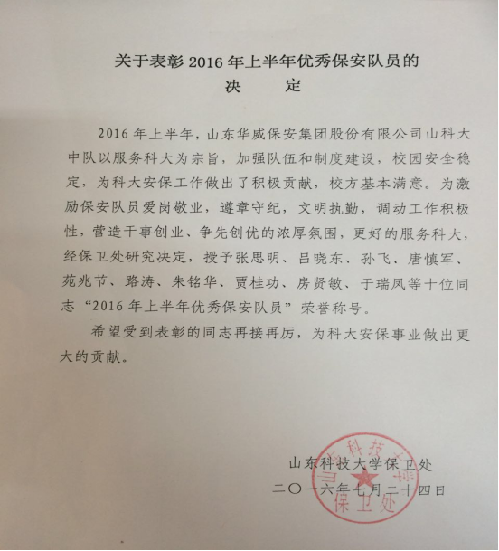 山東科技大學(xué)項(xiàng)目部成立以來(lái),一直以服務(wù)科大為宗旨,貫徹集團(tuán)領(lǐng)導(dǎo)方針,不斷加強(qiáng)隊(duì)伍和制度建設(shè),維護(hù)校園安全穩(wěn)定,為校區(qū)安保工作盡職盡責(zé),營(yíng)造出了一個(gè)良好的校園環(huán)境,經(jīng)山東科技大學(xué)保衛(wèi)處研究決定,授予張思明、呂曉東、孫飛、唐慎軍、苑兆節(jié)、路濤、朱銘華、賈桂功、房賢敏、于瑞鳳十位同志“2016年上半年優(yōu)秀保安隊(duì)員”榮譽(yù)稱(chēng)號(hào),保衛(wèi)處周處長(zhǎng)親自為獲獎(jiǎng)隊(duì)員頒發(fā)證書(shū)及每人500元獎(jiǎng)金。