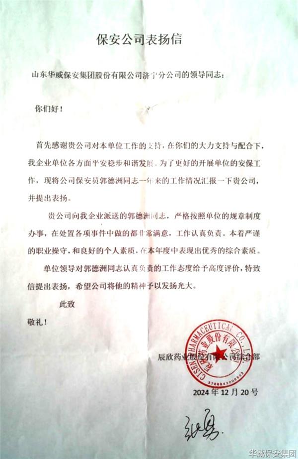 龍影漸遠(yuǎn)辭舊歲,吉蛇獻(xiàn)瑞啟新程。新春之際,華威保安濟(jì)寧分公司,先后收到了來自客戶辰欣藥業(yè)、煙草公司配送庫的兩封表揚(yáng)信,對(duì)駐勤華威保安團(tuán)隊(duì)、保安隊(duì)員郭德洲一年來在...