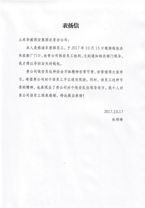 近期,曲阜分公司保安隊員在執勤中做好人好事不斷,當事人也分別送來多封表揚信、感謝信: 2017年8月15日,駐裕隆實業保安班隊員孔祥東在巡邏時撿到錢包一個,內有...