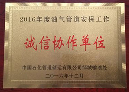 12月20日,安防公司被中石化管道儲運有限公司鄒城輸油處授予“2016年度油氣管道安保工作誠信協作單位”榮譽稱號。 今年以來,由安防公司承攬的中石化管道儲運有...